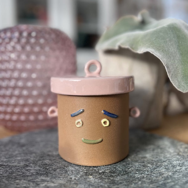 Denne lågkrukke har et sjovt og genert udseende på grund af dets farverige ansigtsudtryk.