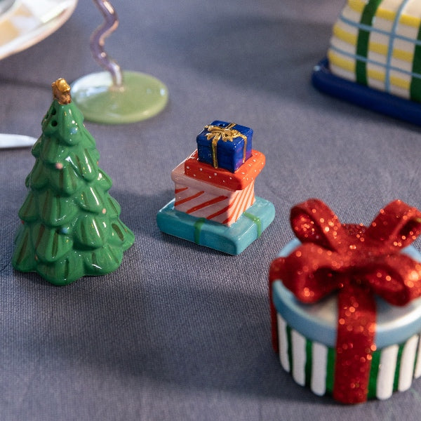 En salt- og peberstrøer, formet som et juletræ og gaver. Super sjov tilføjelse til julebordet. De skønne små detaljer og de klare, julede farver gør dem både eventyrlige og legende og skaber er en stilfuld julestemning til ethvert måltid.