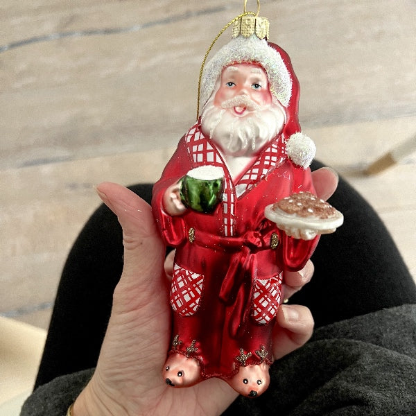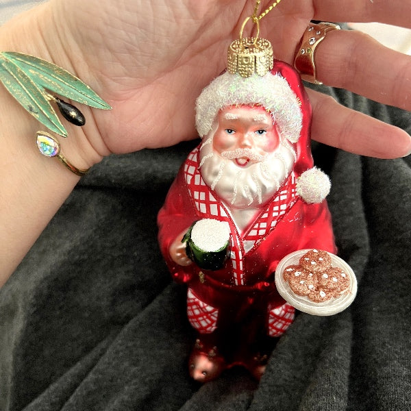 • Sjov håndlavet glaskugle som forestiller en julemand, der holder en tallerken med småkager og en kop varm mælk.